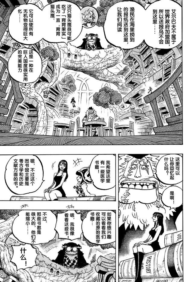 情报师给出的第一张谜语图就是关于三叶草博士的,他再次出现了,这肯定是回忆剧情,罗宾和萨乌罗等人回忆三叶草博士。他们没有参加宴会,在猫头鹰图书馆里看书,这些书籍都是奥哈拉留下来的,当年的奥哈拉事件,世界政府为了消灭所有的学者,他们直接对奥哈拉发动了屠魔令,三叶草博士也是死在CP0手中。